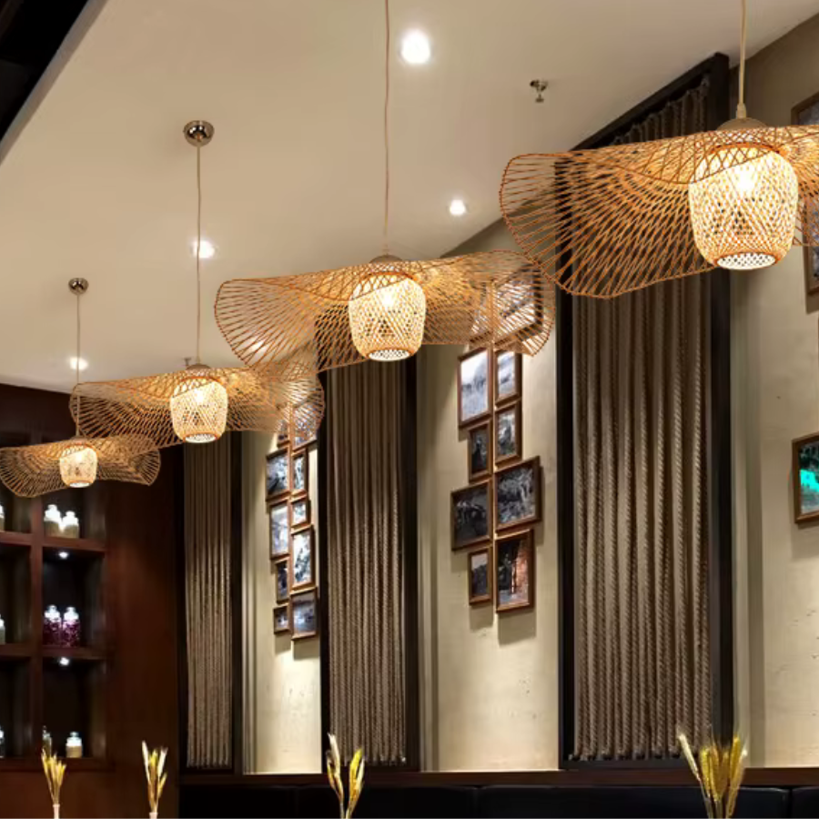 Suspension Vertigo en rotin et lampe de table : style bohème et atmosphère chaleureuse
